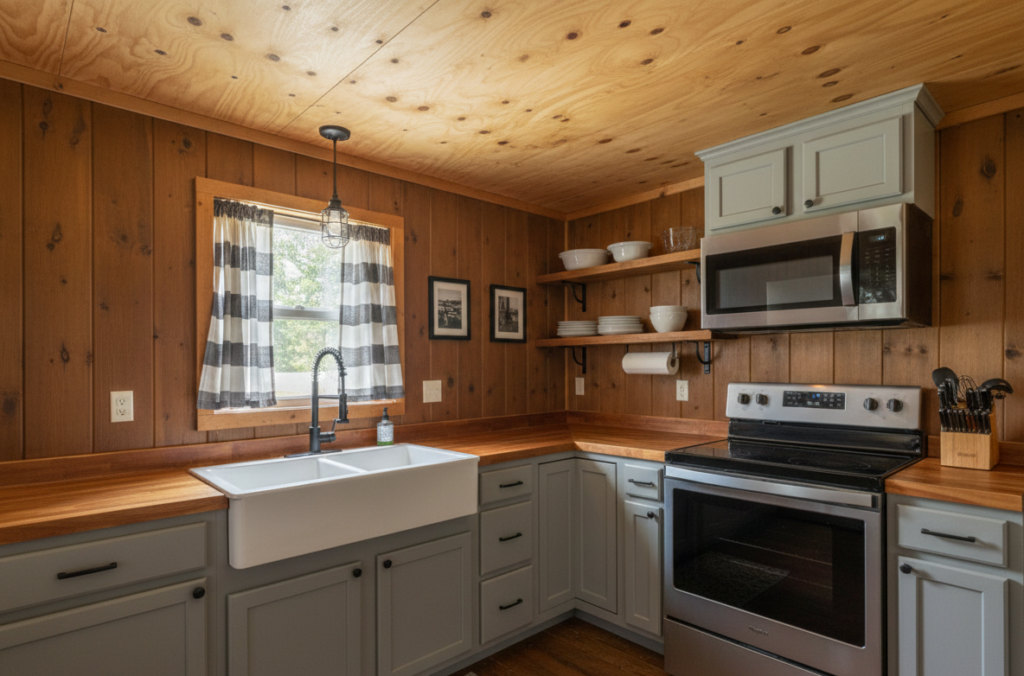Emma could. She transformed the space step by step, adding soft gray cabinets and warm wooden countertops that brought life to the interior. A farmhouse sink became the centerpiece, while open shelves and modern appliances made the small kitchen both stylish and functional. Natural light now fills the room through the window, creating a bright and welcoming atmosphere.